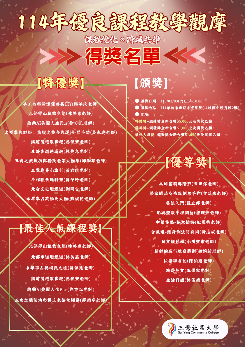 🎉 三鶯社區大學【114年度優良課程評選擂台賽-課程優化 × 跨域共學】得獎名單出爐啦!