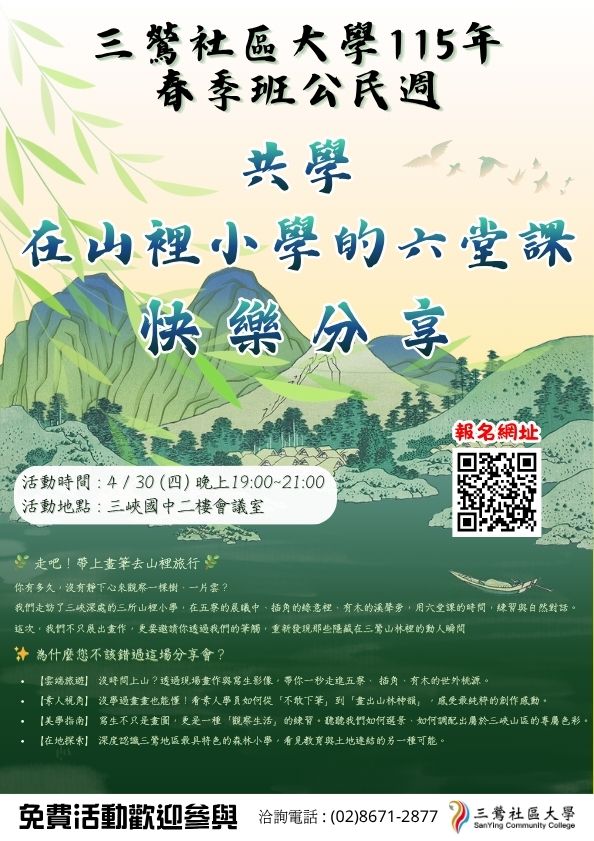 共學在山裡的六堂課快樂分享 : https://forms.gle/UKyPPzxqupCZFTqs6